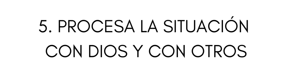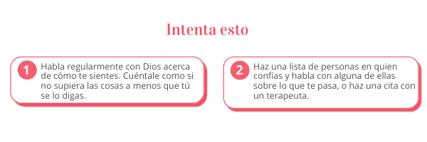 Además de esto, es bueno invitar a otros a caminar en este proceso con nosotros. Muchas personas hablan de lo que les pasa con un amigo, familiar o líder de la iglesia y se sienten mejor. Logran llegar a la raíz de sus conflictos, los procesan, y agarran fuerzas para seguir adelante. Si tú no tienes a esa persona; si hablar con alguien de tu círculo de amigos no te funciona; si tus familiares y amigos están lejos, o si te da vergüenza hablar del tema con gente que te conoce, ir a terapia es una buena opción si está a tu alcance. Una buena terapia o consejería cristiana puede ayudarte a entender mejor la situación y a procesar tus pensamientos o emociones de un modo adecuado. En lo personal, me he beneficiado de ir a sesiones de terapia y contar con alguien que, no solo oraba por mí, sino que también me escuchaba y me hacía preguntas importantes.