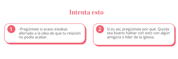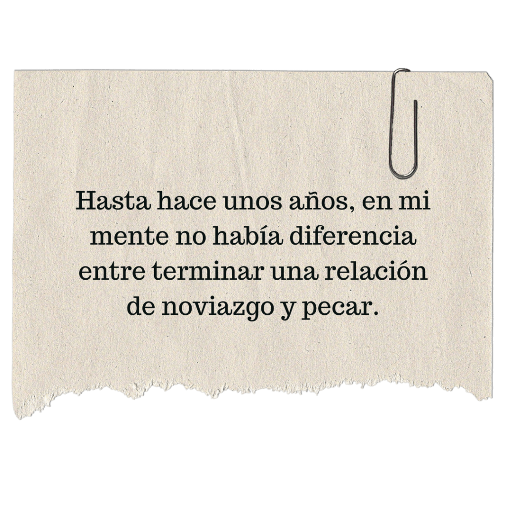 En mi caso particular, crecí en un ambiente cristiano en que terminar una relación de noviazgo es como firmar un divorcio. Por tanto, hay mucha vergüenza asociada con una ruptura. Existe la idea de que “si tienes una buena relación con Dios, Él te ayudará a escoger y no te equivocarás”. También, asumimos que:
